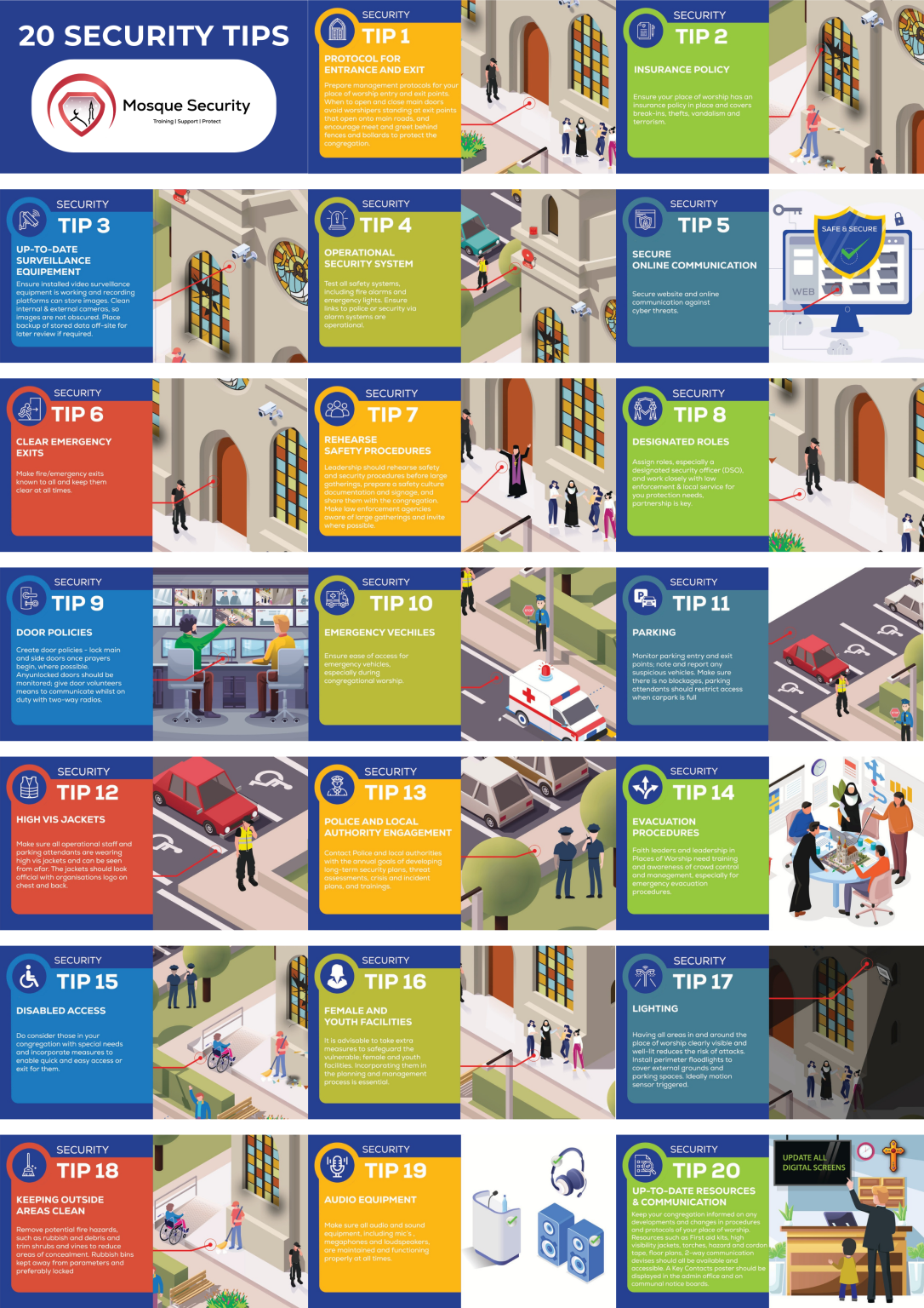 This resource brings together twenty practical security measures designed to help mosques improve day-to-day safety, strengthen preparedness, and reduce risk during both routine activities and large congregational gatherings.
